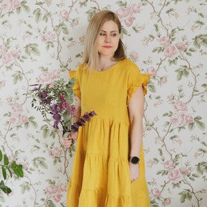 Mustard Linen Dress For Summer Organic Linen 3 4 Sleeves Linen Dresses For Women Summer Dress Linen Midi Dress 25 Colors Etsy De